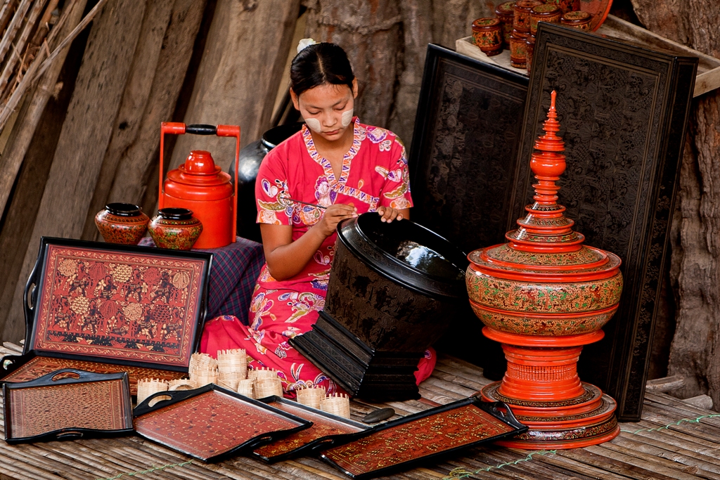 Transfert à la plus ancienne boutique de laque de Bagan, et entrez l'atelier où chaque phase de la production, de diviser le bambou à la conception de gravure, est effectuée. Chaque étape est décrite en détail en donnant une compréhension détaillée de la façon dont cet art ancien est devenu une forme d'art. Le processus commence par la formation des articles de bambou qui sont ensuite peints avec la laque, un vernis à base de Thit-si, une sève récoltée de l'arbre MelanorrhoeaUsitata. Entre huit et 16 couches de laque sont appliqués en fonction de la qualité souhaitée - un morceau de laque en haut de gamme peut prendre un an à compléter. Après le séchage, la surface est polie avant la dernière étape, qui est le momentoù les choses deviennent créatives!